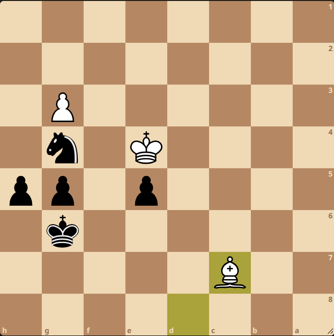 Given this, the reason why 60. Be7? was wrong should be clear. Let’s look instead at the proper reply to 59. … h5?, which is 60. Bc7! (see diagram):